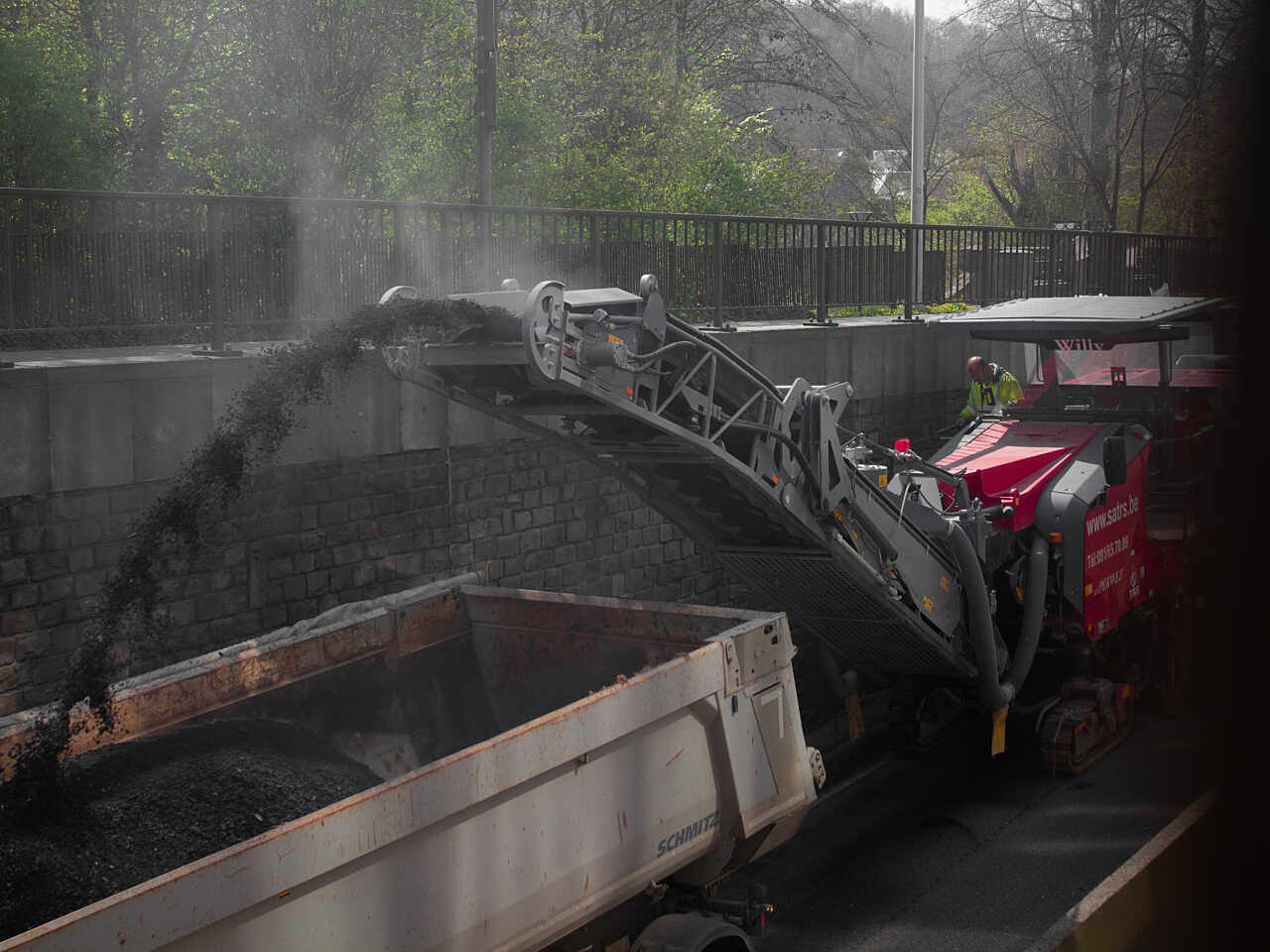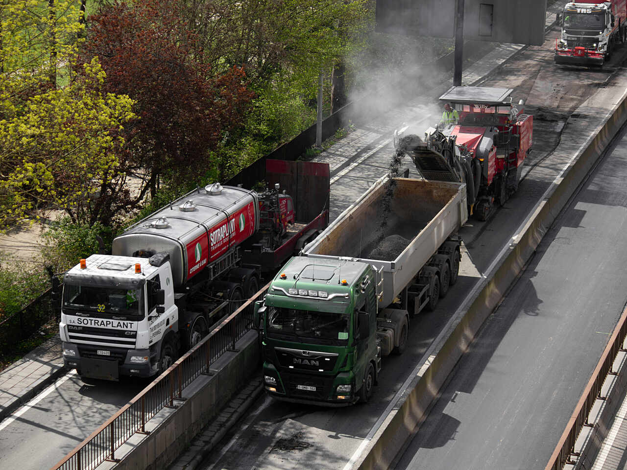 Nos équipes ont d’abord posé la signalisation nécessaire, ont réalisé des interventions de génie civile, ont procédé au rabotage de la couche d'usure (cinq centimètres) et ont procédé à la pose d'un nouvel enrobé hydrocarboné.